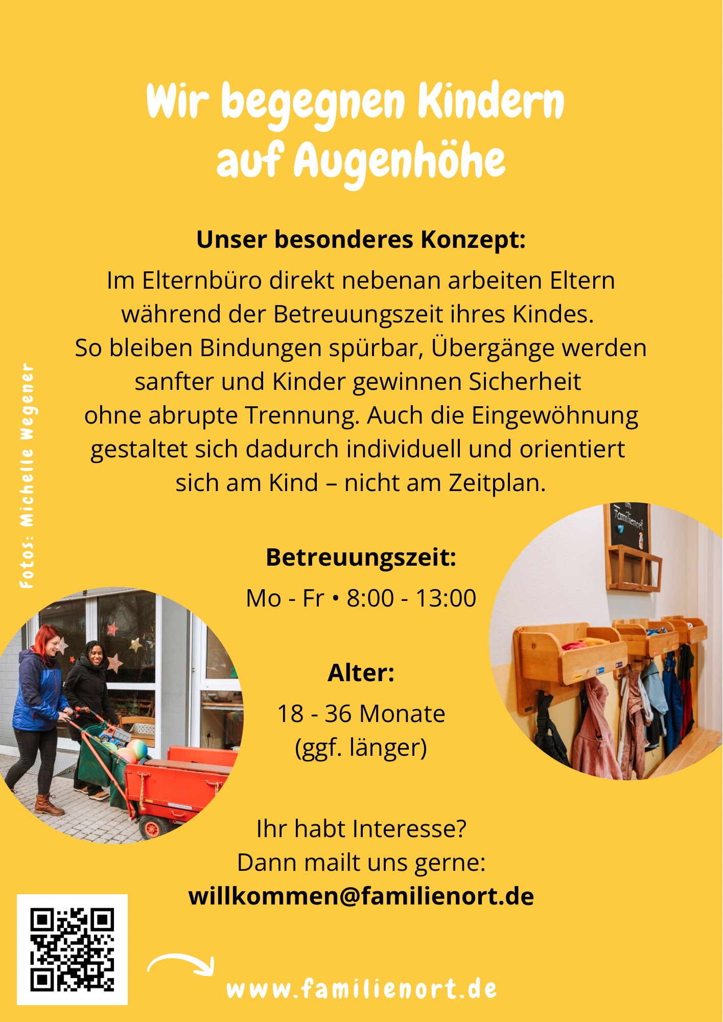 Auf unserer Website finden Sie hierzu demnächst weitere Informationen. Falls Sie bereits vorher Intreresse haben und mehr erfahren möchten, melden Sie sich gerne per E-Mail bei uns (willkommen@familienort.de).
